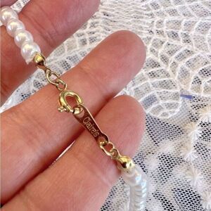 It is in excellent shape with perhaps a little wear at the place where the pearls are attached to the gold rhinestone “V” - the faux pearls show no wear. 18” with additional 1.5” drop of the “V” with pearl. Gold tone spring C clasp with “Claire’s” on the tag. Pretty li’l choker that would look lovely for a special occasion.