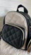 Two zippered compartments and a matching zippered coin purse with gold-tone carabiner clip. Handy top handle plus back straps that adjust for a comfortable fit.