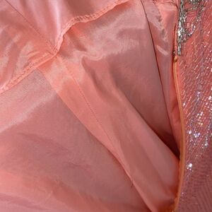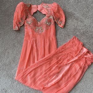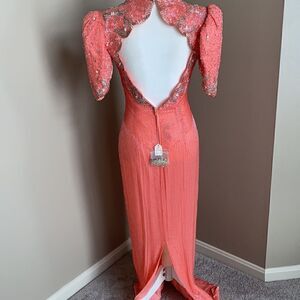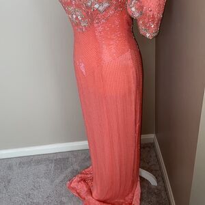 STUNNING 🤩Pageant dress from Paris designer Claire’s Collection. Coral in color with detailed beading and crystals. Sweetheart neckline. Hook and clasp attachment for neck.