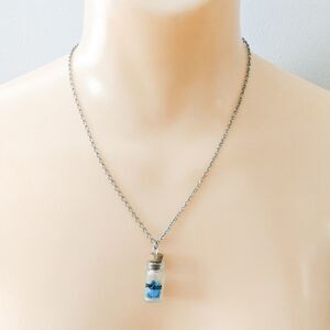 Claire's charm necklace with silver toned chain. Featuring a small bottle filled with turquoise rocks and corked with "peace" written on the outside. Lobster claw clasp and adjustable sizing.