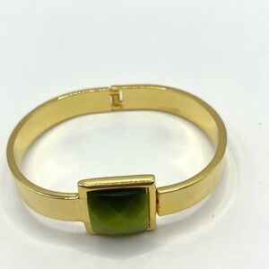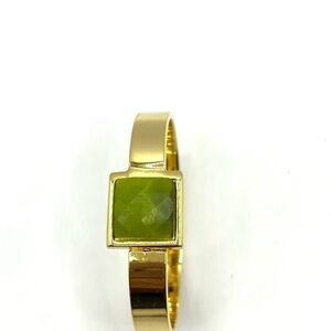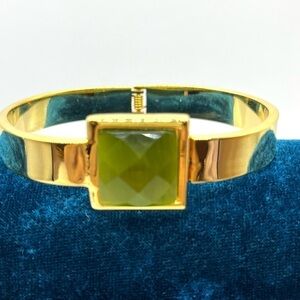 Clamper Style Bracelet Gold Tone with Peridot colored Square Acrylic Stone.