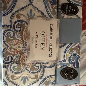 Elegant queen-sized bedding set with intricate patterns. Includes two extra pillowcases. Features a blend of blue, gold, and cream colors.