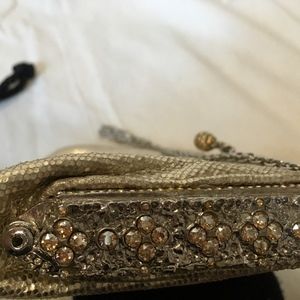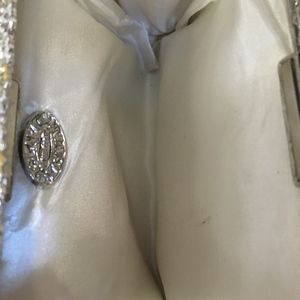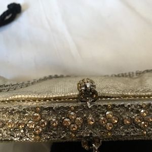 Gorgeous crystal evening bag from Clara Kasavina. Metal side and top frame surrounded in crystals. Two crystal beads pull the clutch open. Bag measures 6.5" x 4" with a 3" opening. Double wrist chain has 5.5" drop. Really beautiful. Dust bag included.