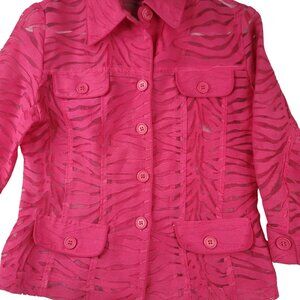 clara s, Fashionable, zebra pattern, Statement, jacket, fuchsia, new with tags, sheer design, XS, button front, chest pockets, lightweight jacket, polyester blend, stylish outerwear