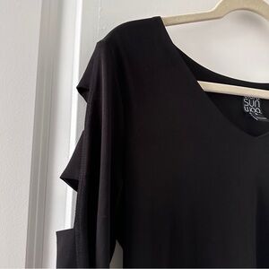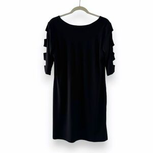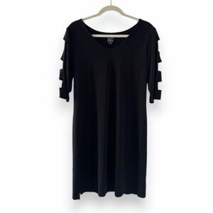 Black stretch knit dress with square cutout ladder sleeves. V neckline, hits above knee, shirt silhouette. Pre-owned in excellent condition, no holes or stains.