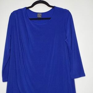 Clara Sun Woo Colorblock Shift Dress Size L. Retro style dress in a slinky fabric with a red velvet/velour band near the hem and an asymmetric front layer.