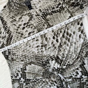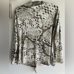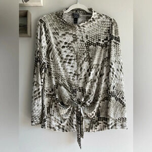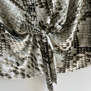 Neutral colored reptile skin blouse with front tie detail and an open mock neck. Size large