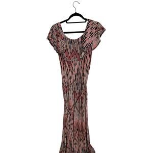 A Bohemian-chic print, featuring a basket weave pattern, in shades of coral and black with subtle hints of white and mustard.