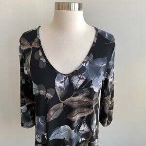 Clara Sun Woo Scoop Neck Tunic Black Grey Leaf Blouse Split Hem 3/4 Sleeve Small