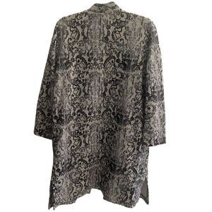 This beautiful navy blue and light gray print longline open front cardigan is by Clara Sun Woo. The long sleeve cardigan is super soft, has some stretch and has pockets. It is made in the U.S.A and is in fantastic condition. Women’s size medium.