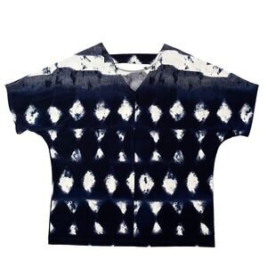 Gently worn short sleeve top from Clara Sunwoo featuring an allover abstract print in predominantly navy blue and white. Shirt features a cool triangular cut-out at the back just beneath the collar.
