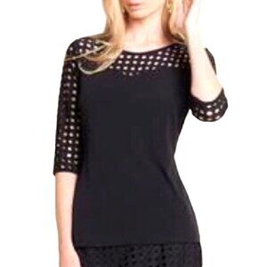 This top from Clara Sun Woo is in excellent condition. It is in a solid black color in a liquid jersey fabric. It features; scoop neckline, elbow length sleeves, laser cut-out details on sleeves, front and back yoke, side vents, wrinkle free and a high low hemline with a pullover style. Made from a polyester, rayon and spandex blend.