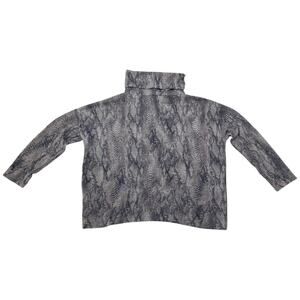 DESCRIPTION: Gently worn long sleeve sweater top features an allover gray and blue snake skin pattern design and a cowl-style turtleneck.