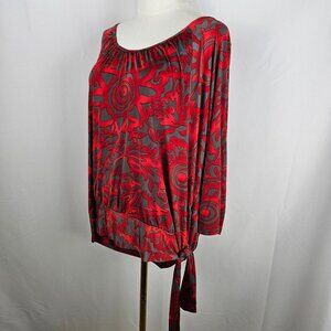 This tunic top combines a bold abstract red and gray design with a flattering side tie hem and 3/4 sleeves. Ideal for office or casual wear.