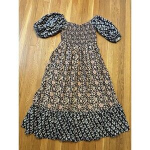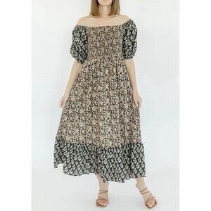 Clara The Label Noah Dress Antique Brass Puff Sleeve Smocked Block Print Maxi S