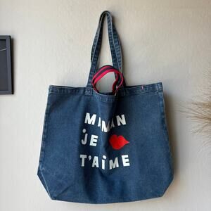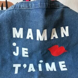 Clare V. 100% cotton denim tote bag. Graphic design with phrase "Maman Je T'aime" meaning "I love you Mom". Blue with white and red details. No inner pockets, so a carry all tote bag. With top handle + a shoulder strap. Made in LA.