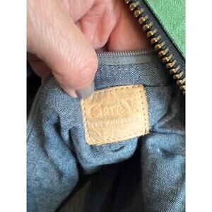 Clare V Le Zip Sac Slouchy Tote Bag in Green Leather & Cotton. Good preowned condition with a couple of pen marks on the leather pockets and a small bit of wear on one corner, see pics. Chunky zip top with brass hardware, two exterior slip pockets.