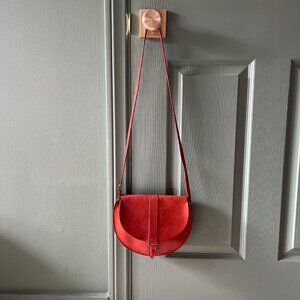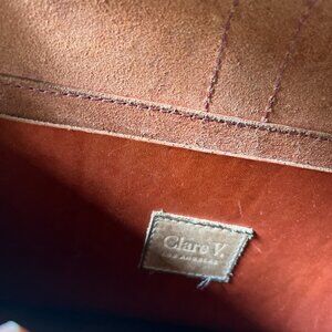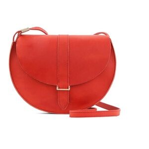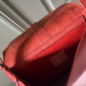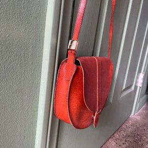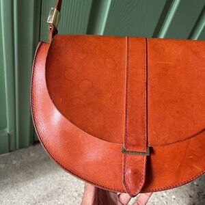 Beautiful leather bag in a rich brick orange-reddish brown natural warm toned leather. 2nd picture is most accurate in terms of the color. Last pics show brown tone in different lighting as well as the adjustable strap. This is natural veg tanned leather and not a painted on sort of color you would find on a cheaper bag. Originally bought for over $300. Leather has a natural patina from wear, this will be a great piece for many decades to come. Leather conditioner would even it out if you prefer that look, but it looks great in person as is. Gold hardware. Straps can be adjusted if you want it to be a shoulder bag vs a crossbody.