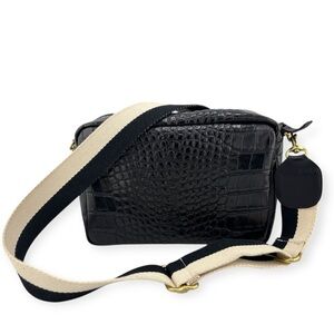 Clare V. 'Marisol' Crossbody Bag in Black Croco. Front pocket. Fabric crossbody strap with gold buckles. Zipper closure at the top. Fabric lining with pocket. Condition: Excellent. No flaws. Height 6", width 9", depth 3".