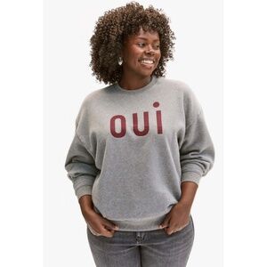 Fleece.Crewneck sweatshirt. Pullover style. Grey Melange with large Bordeaux "Oui" print. Made in Portugal.