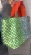 This vibrant woven tote bag features a striking checkered pattern in green and blue, complemented by bold red handles. Perfect for adding a pop of color to any outfit.