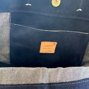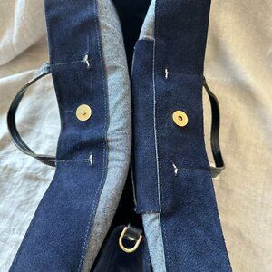 Used Clare V. Simple tote in navy suede and blue chambray interior. Black leather top handles and two d-rings to add a shoulder or crossbody strap (this strap not included). Bag is in used but good condition, the interior is clean. Tried to show all imperfection in the photos. This is a soft slouchy bag and holds a lot. Has a flat bottom with gold feet.