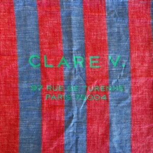 Limited edition Clare V tote from the 2023 Paris pop-up store, with bold red and blue stripes.