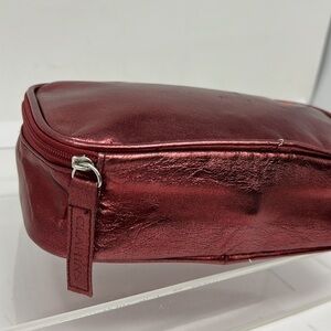 This is a great Clarins Metallic Red Zip Around Cosmetic Pouch. Shows some minor scuffs and spots, but overall good condition. Tip zip around closure. 8” x 4” x 2.25”. No odors. No tears. Lined interior.