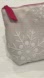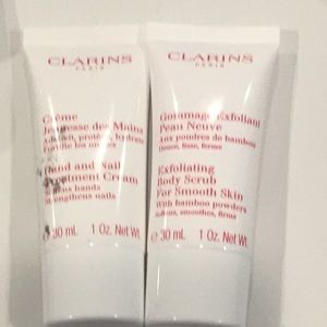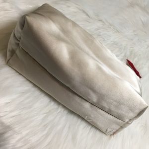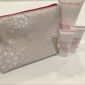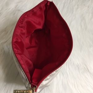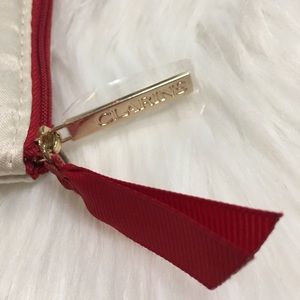 Cream with white snow flakes & red lining large make up bag. Has a top zipper closure with signature Clarins polished gold zipper pull. Content is 100% Polyester. $20
