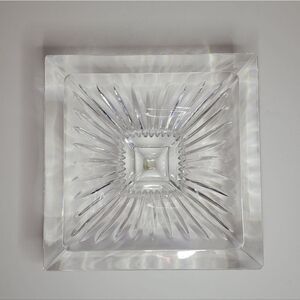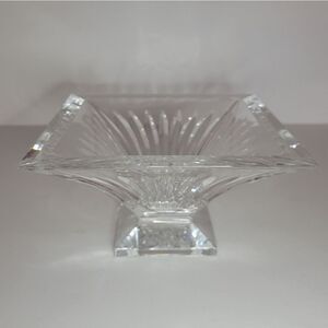 Handcrafted of solid leaded crystal, this bowl features beautiful hand cut designs that will add an elegant touch to any setting. Shaped like an inverted pyramid shape resting on a geometric base, the body has lovely wedge cuts that create a colorful prismatic effect, and a gently flaring contour ends in a softened rectangular rim. The bowl measures 6" across at the rim and stands 3 3/8" tall. No chips, cracks, or damage- pristine condition.