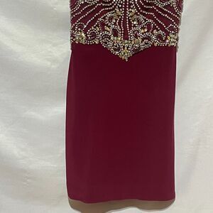 Channel your inner goddess in this burgundy crystal embellished shimmering sequins and rhinestones column mini dress. Polished to perfection, this sophisticated cocktail dress from Clarisse is a glamorous choice for your special night. Sleeveless bodice with chic jewel neckline featuring a plunging cutout center for a unique and daring look. Embellished with twinkling crystals in a lovely scrolling pattern, this form fitting ensemble has a smooth lower bodice and glittery metallic sequins beaded sheer mesh back. Stunning above the knee hem, fully lined, ending with a hidden back zip closure.