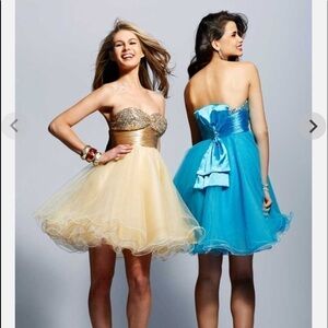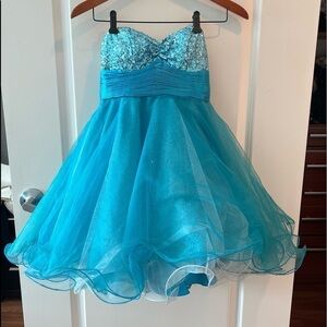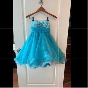 Adorable Turquoise short prom dresses by Clarisse. Heart-shaped glittered sequins neckline, gathered empire sash, and multi layers of tulle with curled bottom to give "puffy" effect. Perfect for any event!!! Center back zipper, bow is missing.