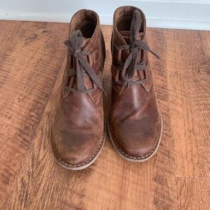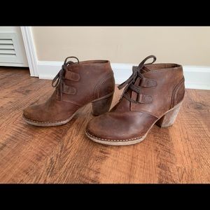 Dark brown Clark booties with 3 inch heels, slip on/tie front. Comfortable, used like new.