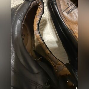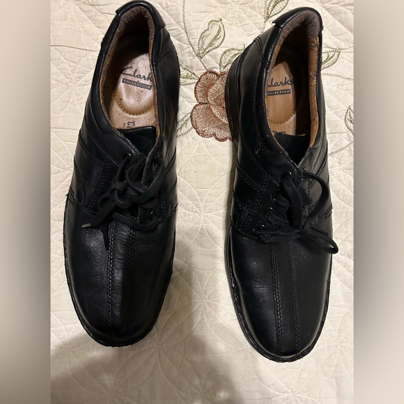 Clark Collection, Laced up and ready for it all. Upper leather, support comfort , rubber sole. Soft cushion with ortholite. Beautiful shoe.. Never been worn peeling around the inside rim of the each shoe. View the pictures.