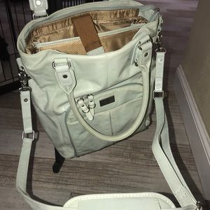 Leather, good condition, comes with crossbody strap. Light blue/teal.
