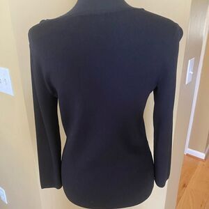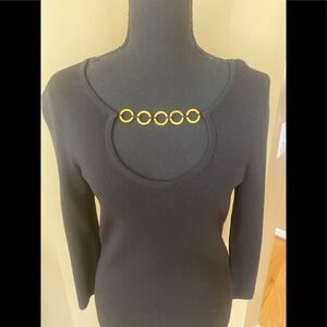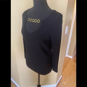 Beautiful and never worn! Clark and Gauge long 3/4 sleeve black knit sweater. Size small. Gold chain embellishment at front of neckline. Stretchy material that is excellent quality. From a smoke free home!