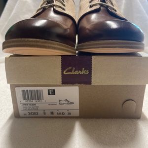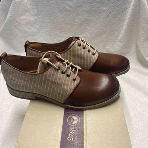 Dark tan leather and and light color. Tie flat shoes.NIB .Smoke free home. No tears.