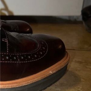 These beautiful formal Clark shoes. They have never really fit well and it is time to let them go. Only worn a few times, maybe not more than 5. You will notice that the right shoe has little bumps at the tip. Want to make sure buyer is aware. I was stepped on and the mark never went away. It’s mostly noticeable if you stare at it but is the only flaw of the shoe. They look and basically are knew. They are a US 9 but run slight small or really would only fit narrow foot. Please feel free to ask away if interested. They are beautiful for formal wear and just with some simple jeans. I am unsure if they are real leather but my instinct tells me they are not.