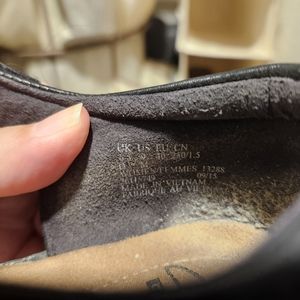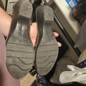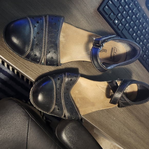 Dark Brown Clark's strap across ankle, short 1/2 in heel. These are so comfortable. Great for work or a job where you have to walk a lot. Any offer considered, thank you guys!