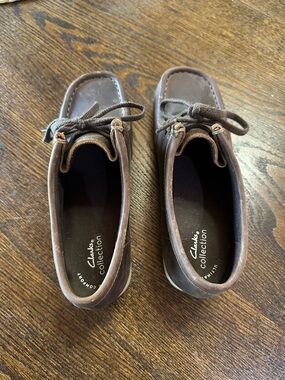 Clarks ankle booties. Cushioned insole for comfort. Classic rounded toe silhouette. Easy slip-on design with subtle elastic gussets.