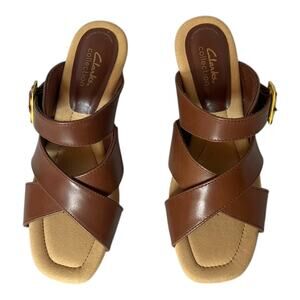 Clarks 7M Kyarra Judi sleek wedge cork heel Crisscross brown strap tan buckles