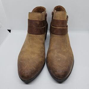 Light brown (brand calls it tan) nubuck leather ankle boots with a darker brown decorative strap around the ankle, with decorative buckle. Zips up the inside for easy on/off. Has factory-produced patina and some additional scuffs for a distressed look. Soles and insoles are in great shape. Heel is approximately 1.25"