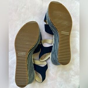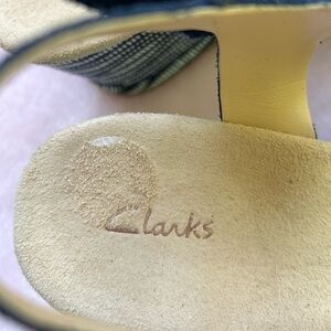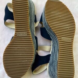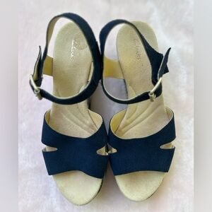Clarks Akilah Eden navy blue suede striped wedge platform sandals.