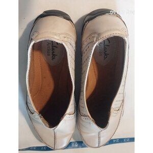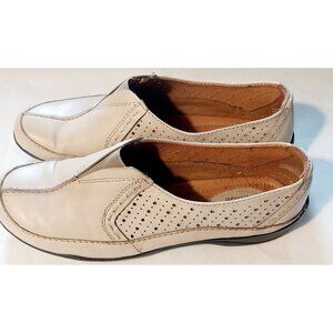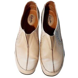 Clarks Artisan Beige Leather Womens Slip-On Shoes Size 9W Perforated Design Comf