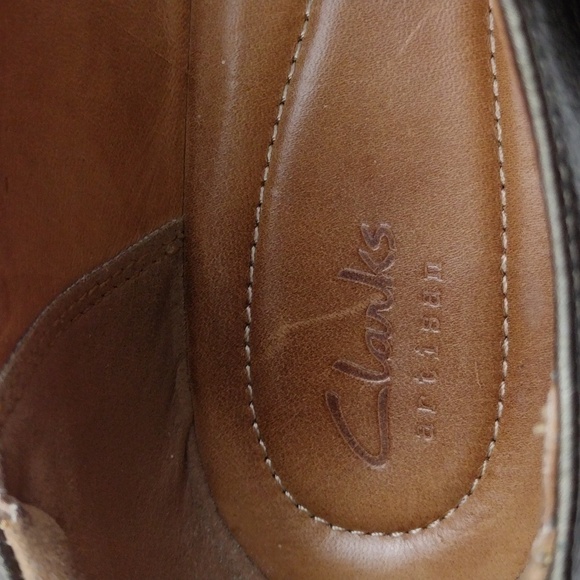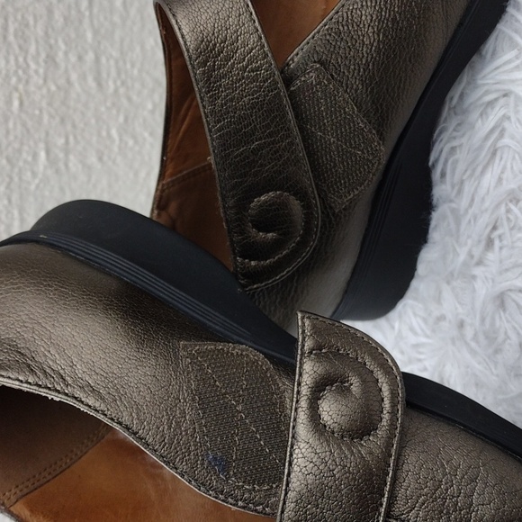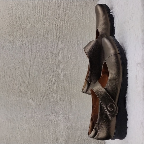 Clarks Artisan Women's Bronze/Pewter Leather Upper Closed Round Toe Velcro Strap Low Heel Maryjane Loafer Style Shoe. Textured Rubber Sole. Leather Footbed. Upper Toe Tip Scuffs. Light Footbed/Sole Marks. Size 9N Color May Vary Due To Lighting.