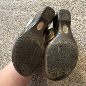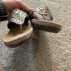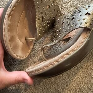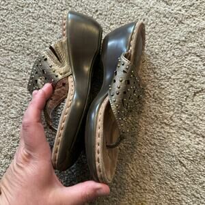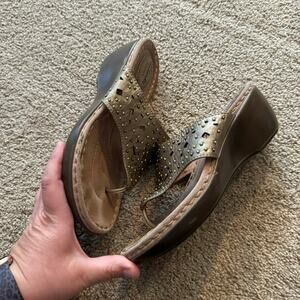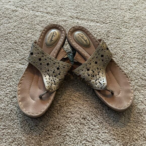 Clarks Artisan Gold Embellished Thong Sandals w/ Short Heel in women's Size 7. Leather. Shoes are in good used condition with some small signs of wear, including at the bottom of heels and the front of the toe area. Please see close-up pictures for condition details and heel measurement. Easy on and off. Quality comfort shoes. Slide on and off.