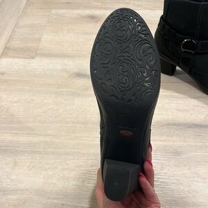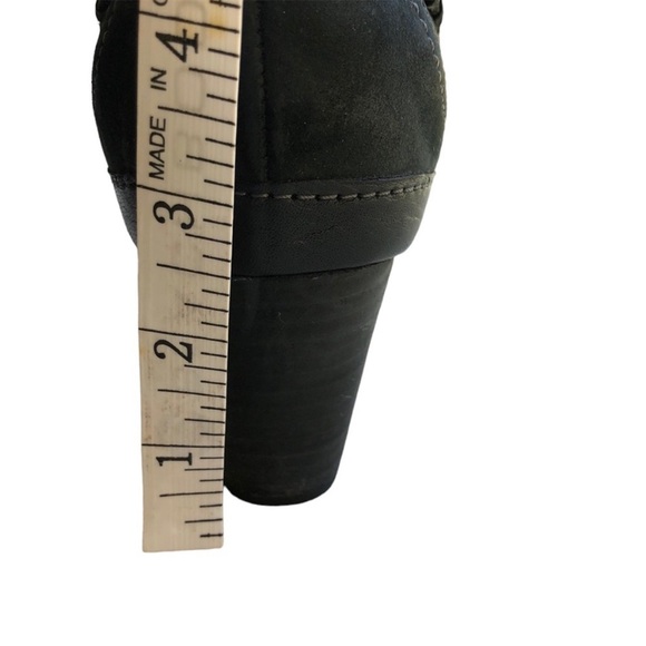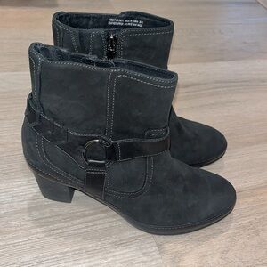 100% Authentic, Clarks Artisan Harness Ankle Booties Womens Side Zip Nubuck leather. Color is a deep charcoal gray black. Versatile color.