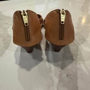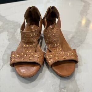 Clarks Artisan Leather Sandal Womens 7.5 Tan Gold Wedge Back Zip Brown Comfort
