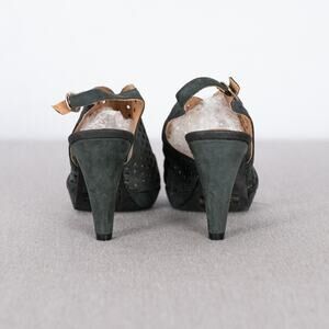 Pre-Owned: Clarks Artisan Leather Slingback Heels Women's Size 7M Open Toe, Laser Cut; Style 26066609; Earthy Dark Sage Color (Gray with Green undertone). 3 1/2" Heel Height.