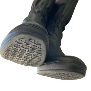 Description: Clarks Artisan Cinched Mid Calf Pull On Boots. These 80s style boots have a chunky heel and a cinched shaft with leather lacing. A casual style boot with top stitching details and an almond shaped toe.